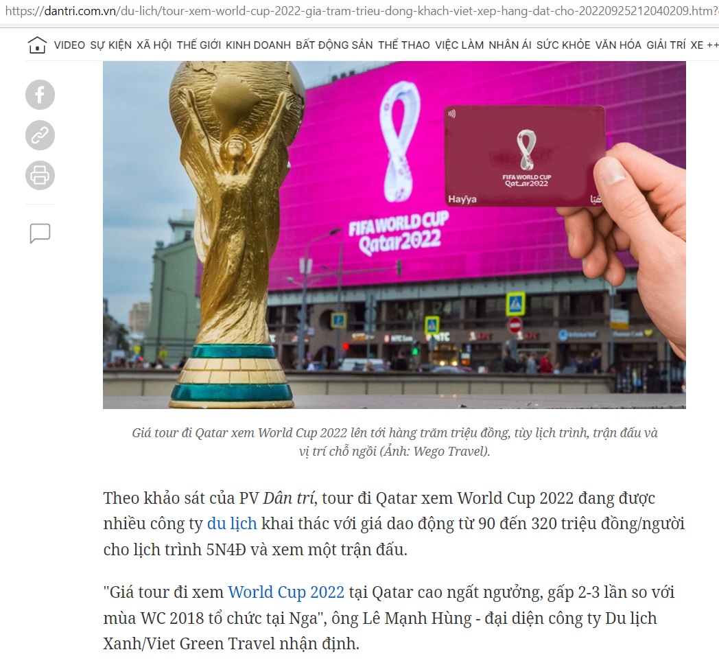 Báo Dân Trí đưa tin: Tour xem World Cup 2022 giá trăm triệu đồng, khách Việt xếp hàng đặt chỗ tại Du Lịch Xanh