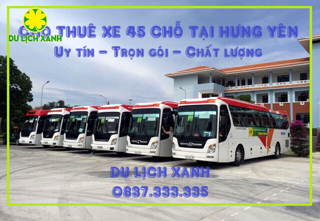 Bảng giá thuê xe 45 chỗ Hưng Yên của Công ty DuLichXanh cho thuê xe 45 chỗ Du Lịch Xanh được cập nhật mới nhất với hơn 3 dòng xe ô tô du lịch 45 chỗ với các đầu xe đời xe mới từ 2019 trở lên và đội ngũ điều hành, tài xế xe 45 chỗ có trên 10 năm kinh nghiệm trong lĩnh vực cho thuê xe tại Hưng Yên luôn sẵn sàng phục vụ và tư vấn tận tình cho quý khách hàng