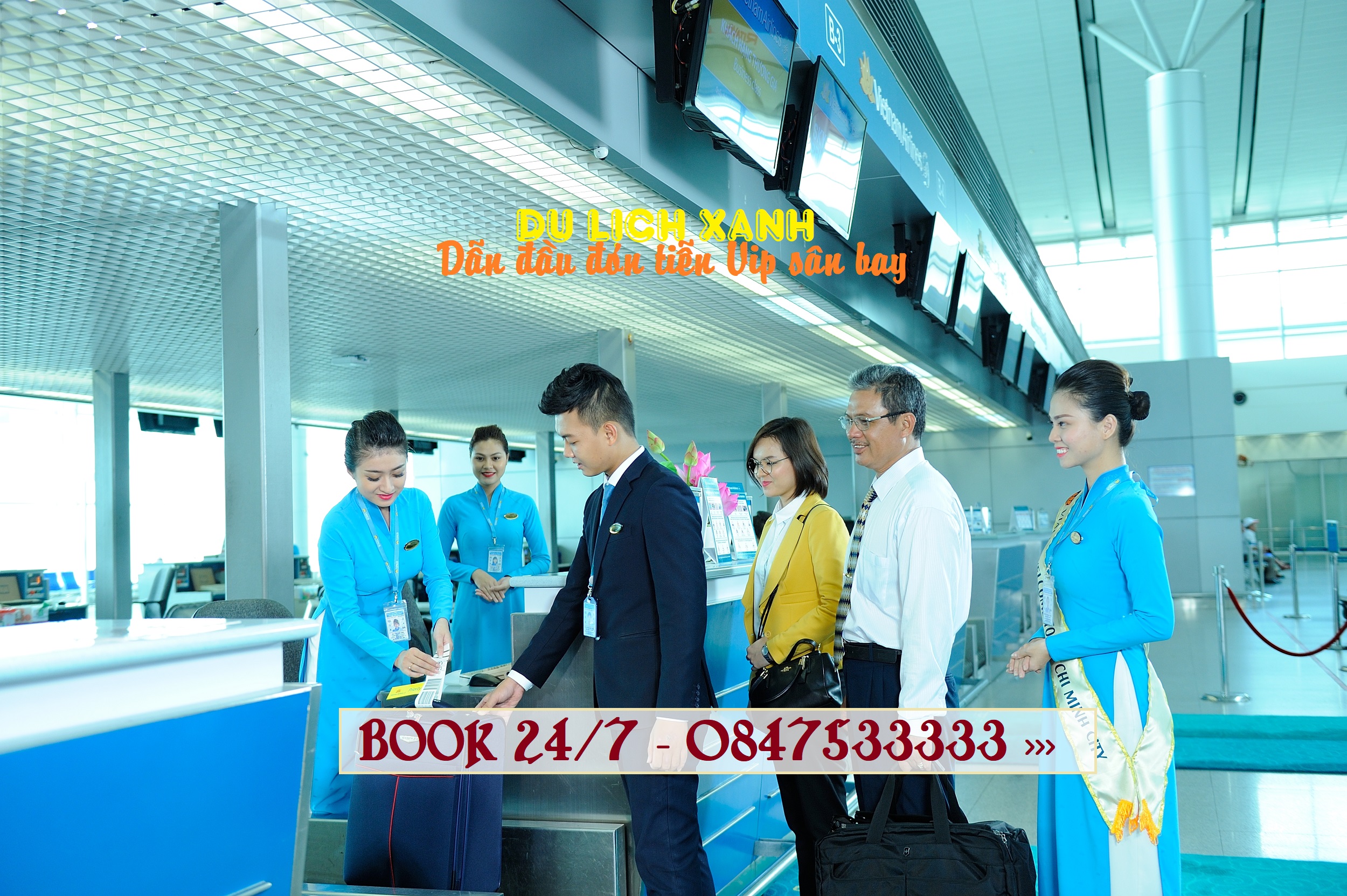 Bước 1: Khi khách đến sân bay Cam Ranh, Nhân viên Du Lịch Xanh / Viet Green Vip sẽ đón khách tại sảnh sân bay đưa đoàn vào sảnh đợi đồng thời nhận hành lý, hộ chiếu của khách.