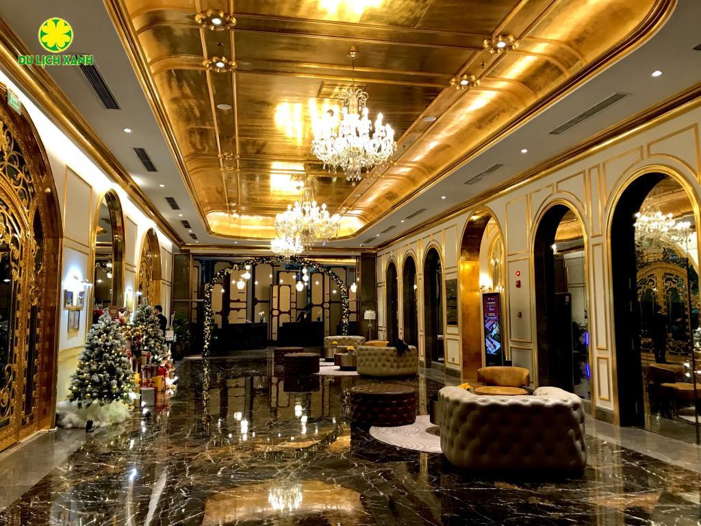 Ngay khi bước chân vào khách sạn Dolce by Wyndham Hanoi Golden Lake, du khách sẽ không khỏi trầm trồ kinh ngạc bởi phong cách thiết kế sang chảnh, từ những viên gạch, đường viền khắp các phòng, hoạ tiết và vật dụng, cho đến những thứ nhỏ bé như dao, nĩa, các vành gương hay thậm chí là một số món ăn đều được dát vàng.