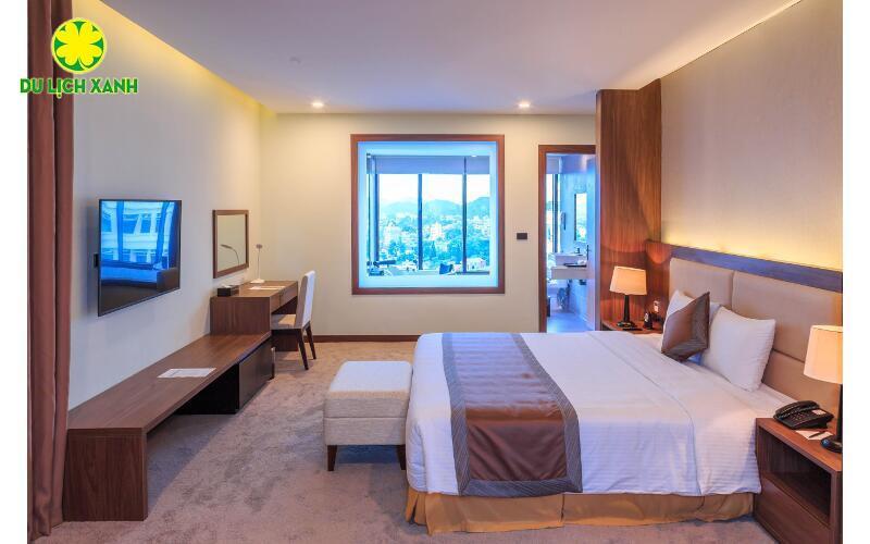 Khi bước chân vào căn phòng này, bạn sẽ nhìn thấy một chiếc giường king size êm ái. Nội thất được bố trí khoa học, giúp không gian như được mở rộng hơn nhưng vẫn tạo được cảm giác thoải mái cho du khách trong quá trình lưu trú. Bên cạnh cửa sổ còn có một bộ bàn ghế sofa để bạn ngồi nhâm nhi trà, ngắm nhìn thành phố lên đèn khi màn đêm buông xuống.