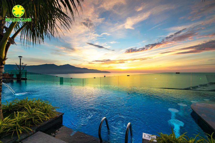 Bể bơi vô cực với hàng dừa soi mình nơi mặt nước cùng khu vườn xanh ngát bao quanh sẽ cho bạn cảm giác như được bơi trong lòng khu rừng nhiệt đới thu nhỏ cùng khung cảnh đại dương bao la bên núi Sơn Trà.