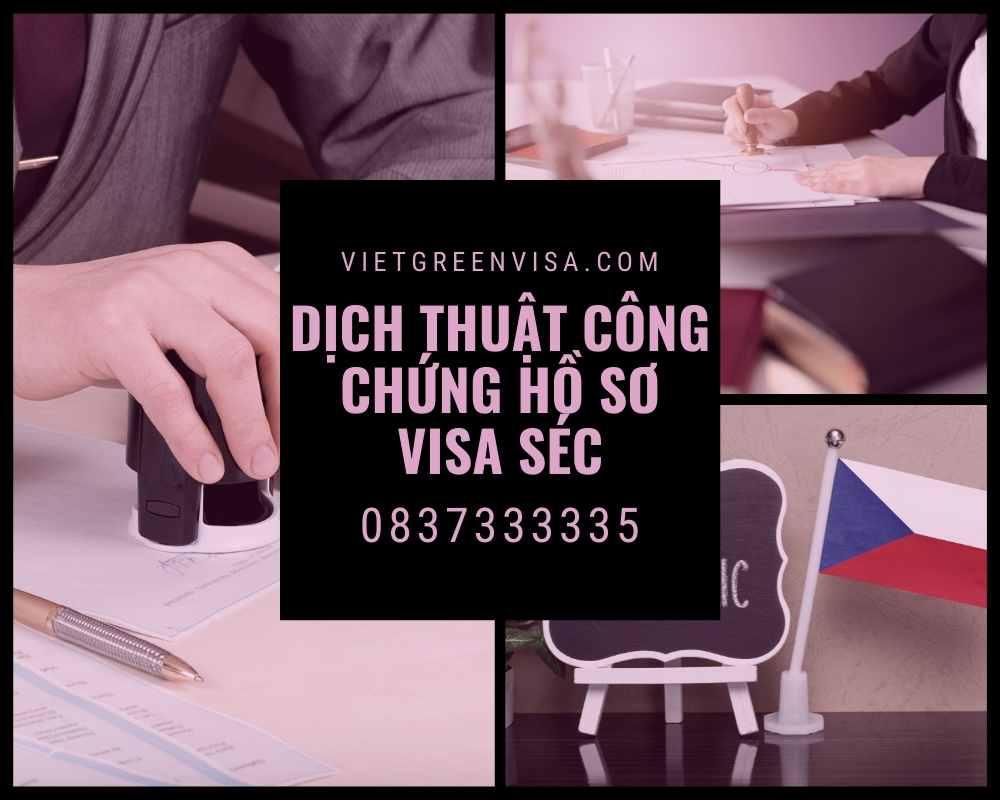 - Viet Green Visa giúp Quý khách sắp xếp hồ sơ giấy tờ xin visa CH SÉC đúng, hợp lệ và tiến hành dịch thuật từ tiếng Việt sang tiếng CH SÉC (hoặc tiếng Anh) và công chứng tư CH SÉC đầy đủ. Một bộ hồ sơ xin visa CH SÉC thường yêu cầu dịch thuật các giấy tờ sau: Sổ hộ khẩu; Giấy khai sinh; Giấy xác nhận tình trạng hôn nhân: thăm khám, chữa bệnh hoặc ly hôn; Hợp đồng lao động/ quyết định bổ nhiệm chức vụ; Giấy xin nghỉ phép; Sao kê tài khoản ngân hàng, sổ tiết kiệm; Thư giải trình, thư mời,...