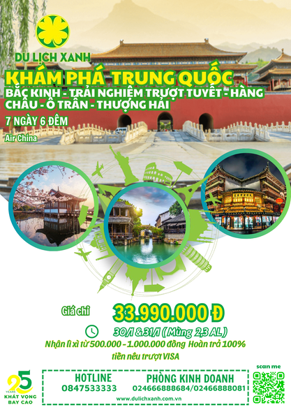 Tour Tết Bắc Kinh Thượng Hải 7N6D đưa bạn đến với các thành phố nổi tiếng của Trung Quốc, từ nét uy nghi của thủ đô Bắc Kinh, sự yên bình thơ mộng của Hàng Châu, đến vẻ cổ kính của Ô Trấn và sự hiện đại, sầm uất của Thượng Hải. Đây là cơ hội tuyệt vời để bạn vừa khám phá lịch sử, văn hóa, vừa trải nghiệm các hoạt động thú vị như trượt tuyết và thưởng ngoạn phong cảnh tuyệt đẹp trong không khí Tết Nguyên Đán. Hãy cùng Du Lịch Xanh khám phá Tour Tết Bắc Kinh Thượng Hải 7N6D, Tour Bắc Kinh Thượng Hải Tết Nguyên Đán năm nay nhé. Mời quý khách liên hệ đặt tour Tết hotline: 0847533333