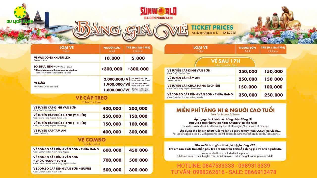 Nếu Quý khách có dự định ghé chơi Núi Bà Đen thì đừng quên nhấc máy gọi liền Du Lịch Xanh - đối tác chiến lược của SunWorld qua hotline 08475.33333 để được tư vấn và hỗ trợ đặt vé vui chơi với mức giá tốt nhất nhé!