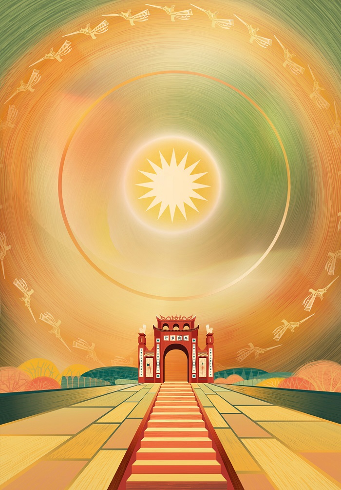 Bức tranh thuộc dự án Sợi Mắc Sợi Mành tái hiện toàn cảnh cổng Đền Hùng được đặt trong một không gian rực rỡ, bên trên là ánh sáng mặt trời tỏa ra, lấy cảm hứng từ chiếc trống đồng Đông Sơn - một biểu tượng văn hóa cũng như minh chứng cho lịch sử truyền thuyết của các Vua Hùng.