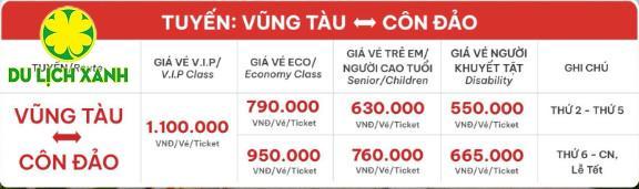 | VŨNG TÀU ➜ CÔN ĐẢO | 1200K | 790K | 630K | 550K | Thứ 2-Thứ 5 |