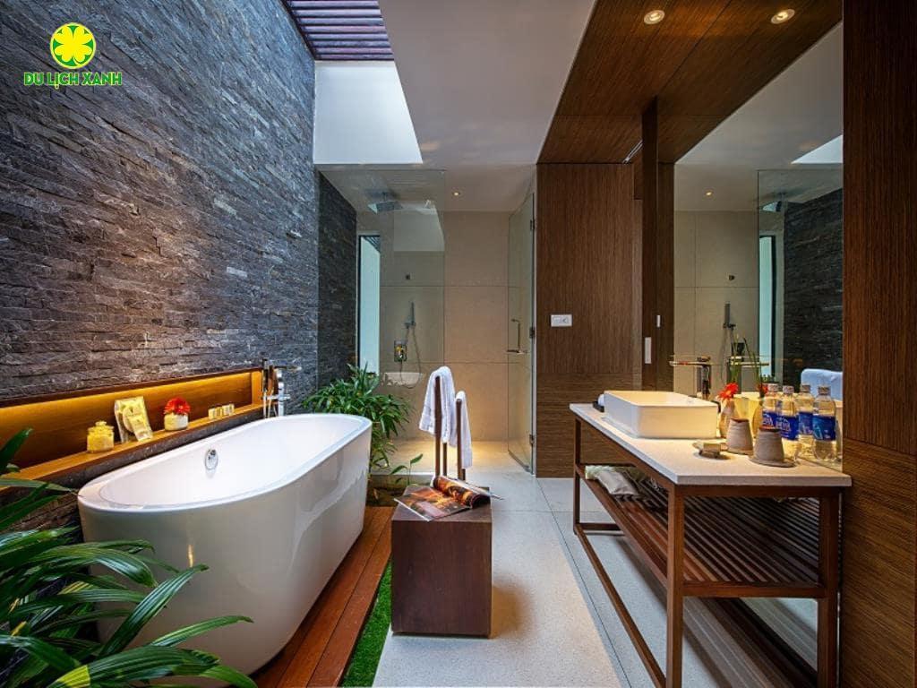 Sự hòa quyện tinh tết của thiên nhiên bao trùm lấy Villas Naman Retreat Đà Nẵng. Từ bên trong phòng tắm du khách như lạc vào chốn thần tiên với cây xanh bao phút đâu đó le lói chút nắng ấm áp màu vàng tô điểm thêm cho căng Villa.